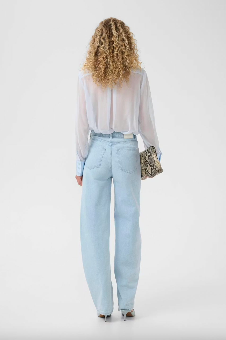 This sheer blouse with long sleeves and a classic shirt collar delivers a relaxed fit with a waist tie for adjustable styling. Designed for both comfort and versatility, it features wide cuffs and soft, lightweight fabric. Scarf is optional / can be worn separately.