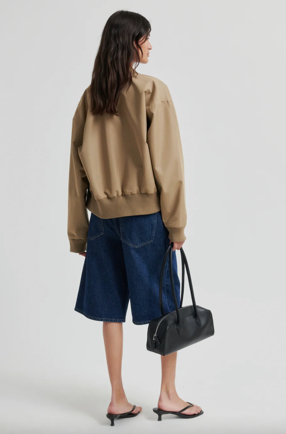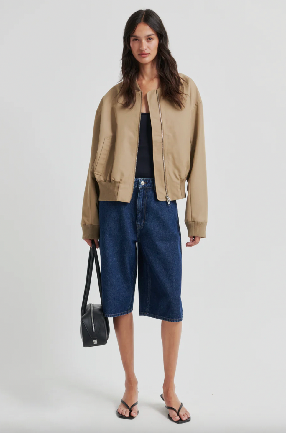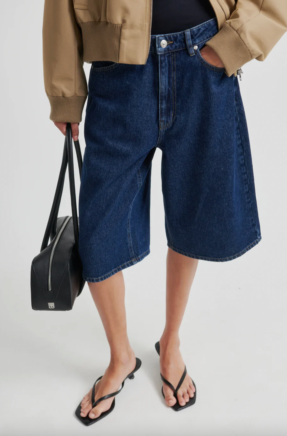 The Columbo Shorts are made in cotton denim with a dark blue wash and contrast stitching. Concealed zip fastening with button at the waist. 5-pocket style. Mid-high waist with wide, straight legs.