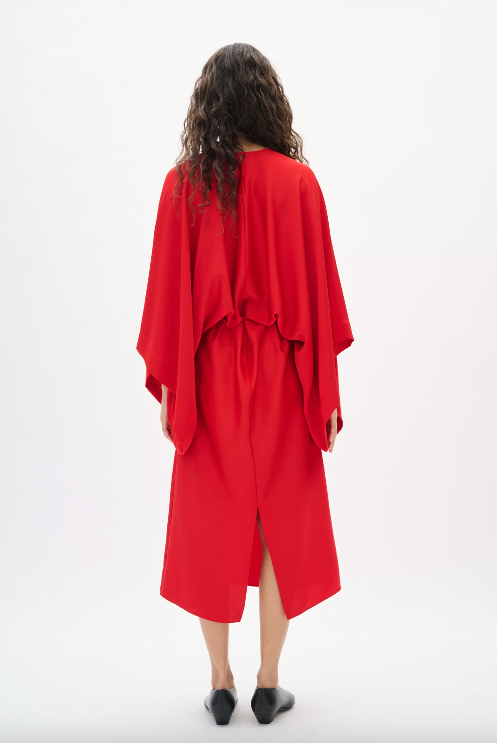 Elegant midi dress with relaxed fit, batwing sleeves, and an adjustable waist tie. Features a classic round neckline and versatile length, offering day-to-evening comfort and easy-wear sophistication.