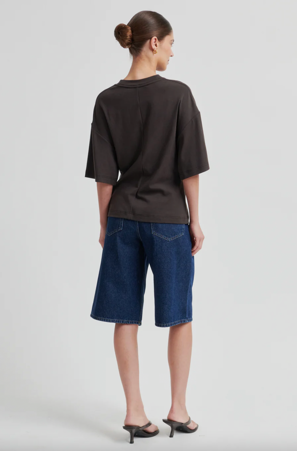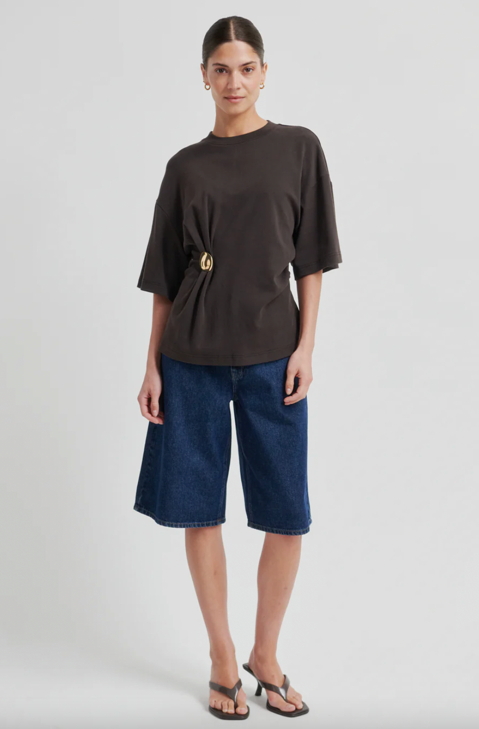 The t-shirt is made in a soft and stretchy lyocell-cotton blend. Featuring a round neck and gathered detail at one side with detachable gold brooch. Dropped shoulders and short sleeves. Regular fit.