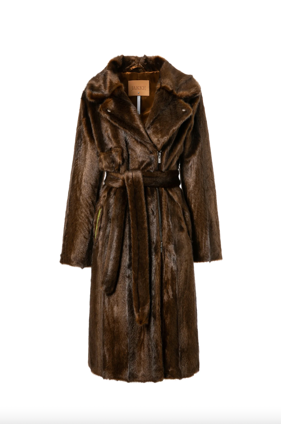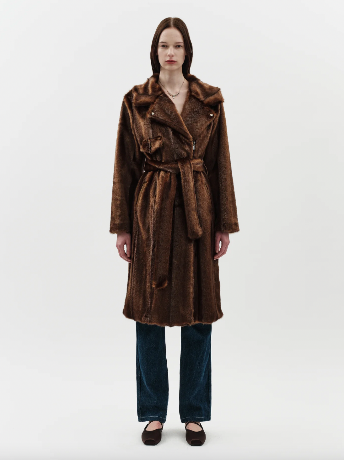 The Frosig Biker Coat is a tribute to the Creative Director’s best friend and namesake, mirroring her muse’s style by blending old Hollywood glamour with biker-inspired elements. Cut from plush faux mink fur, it is belted at the waist and trimmed with silver tone fastenings.