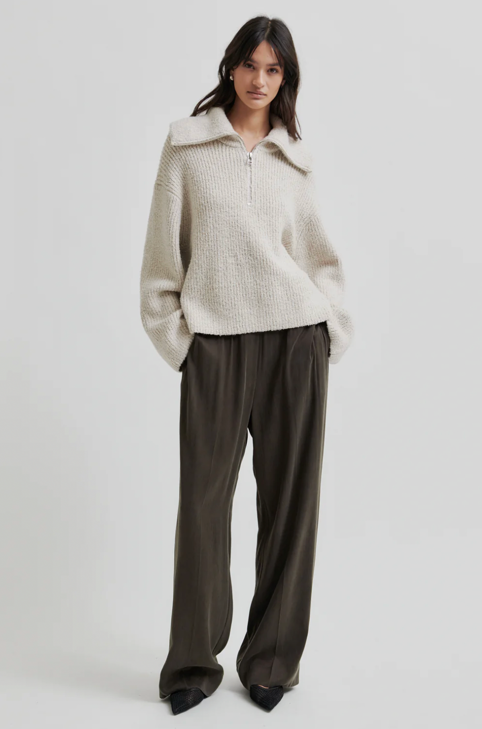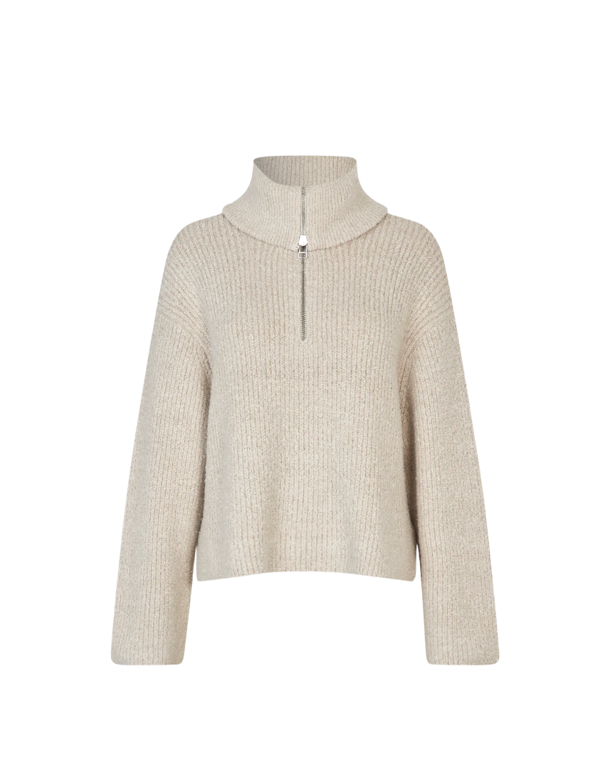 The knit is made in a soft and stretchy cotton blend with thick ribbed structure. Featuring a wide collar and half-zip fastening with metal zip. Dropped shoulders with long, wide sleeves. Slits at bottom hem. Wide, relaxed fit.