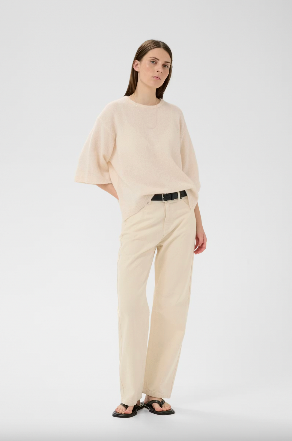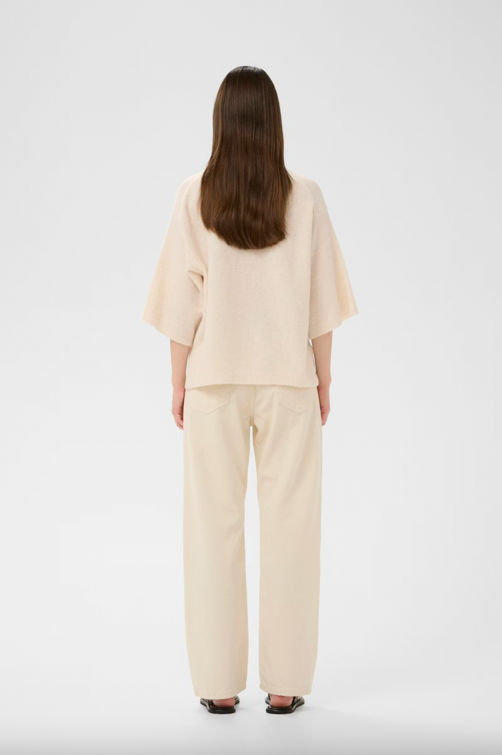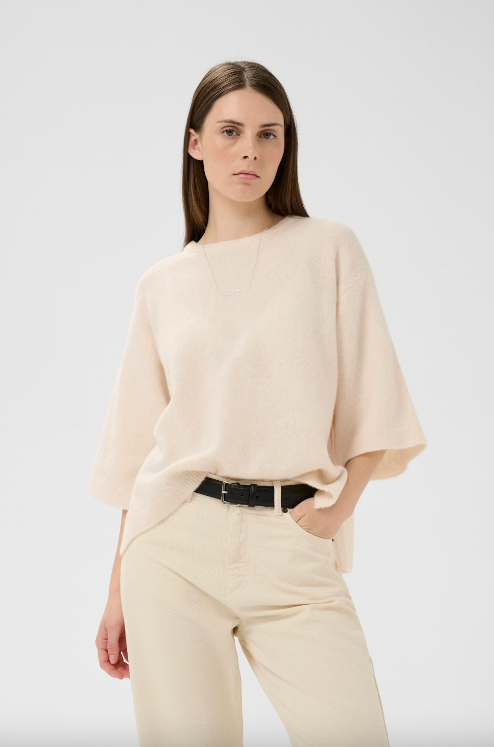 Boxy knit sweater top features a wide crew neckline and elbow-length sleeves. The straight silhouette and soft finish create a relaxed, understated style statement with clean lines and modern proportions.