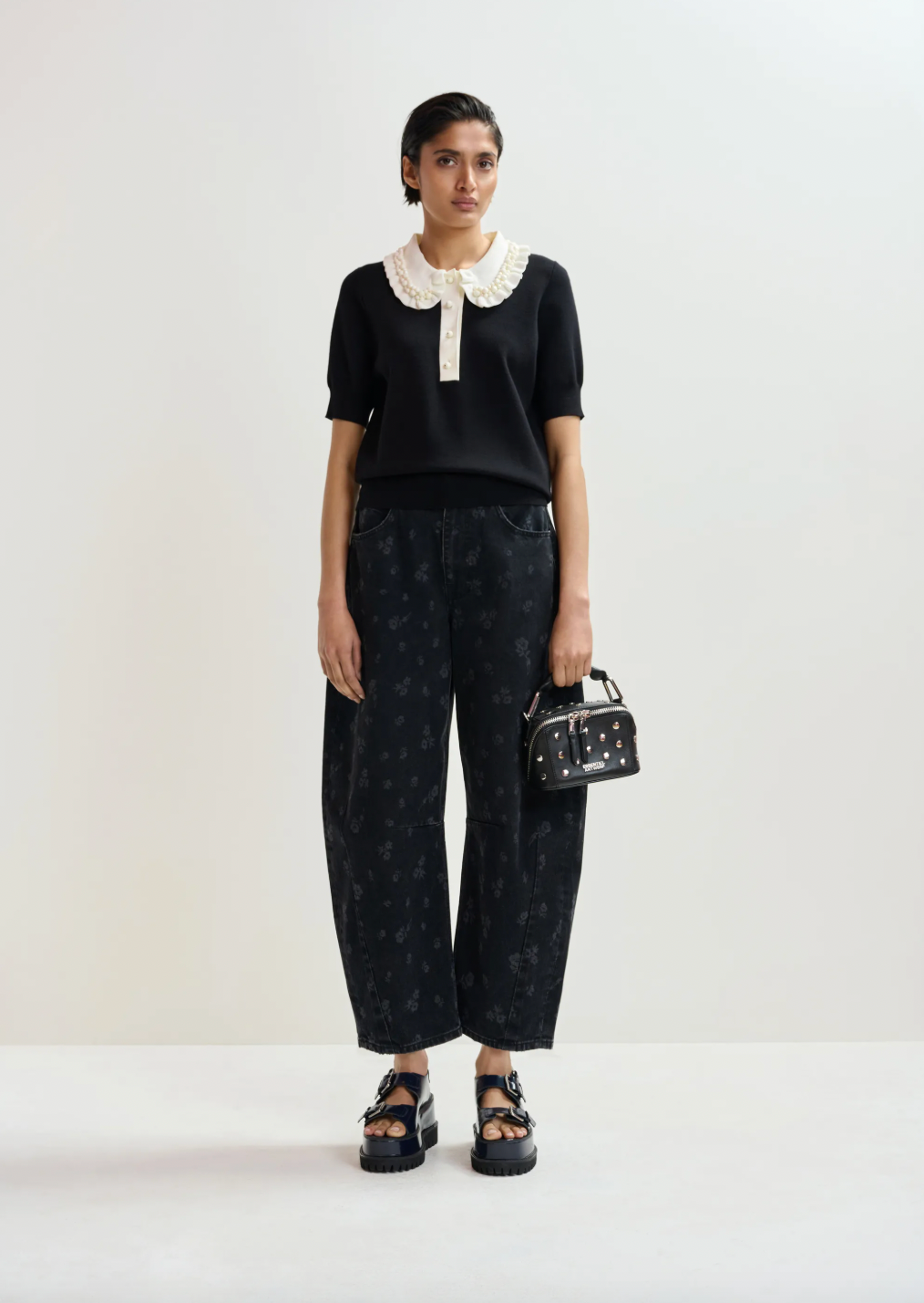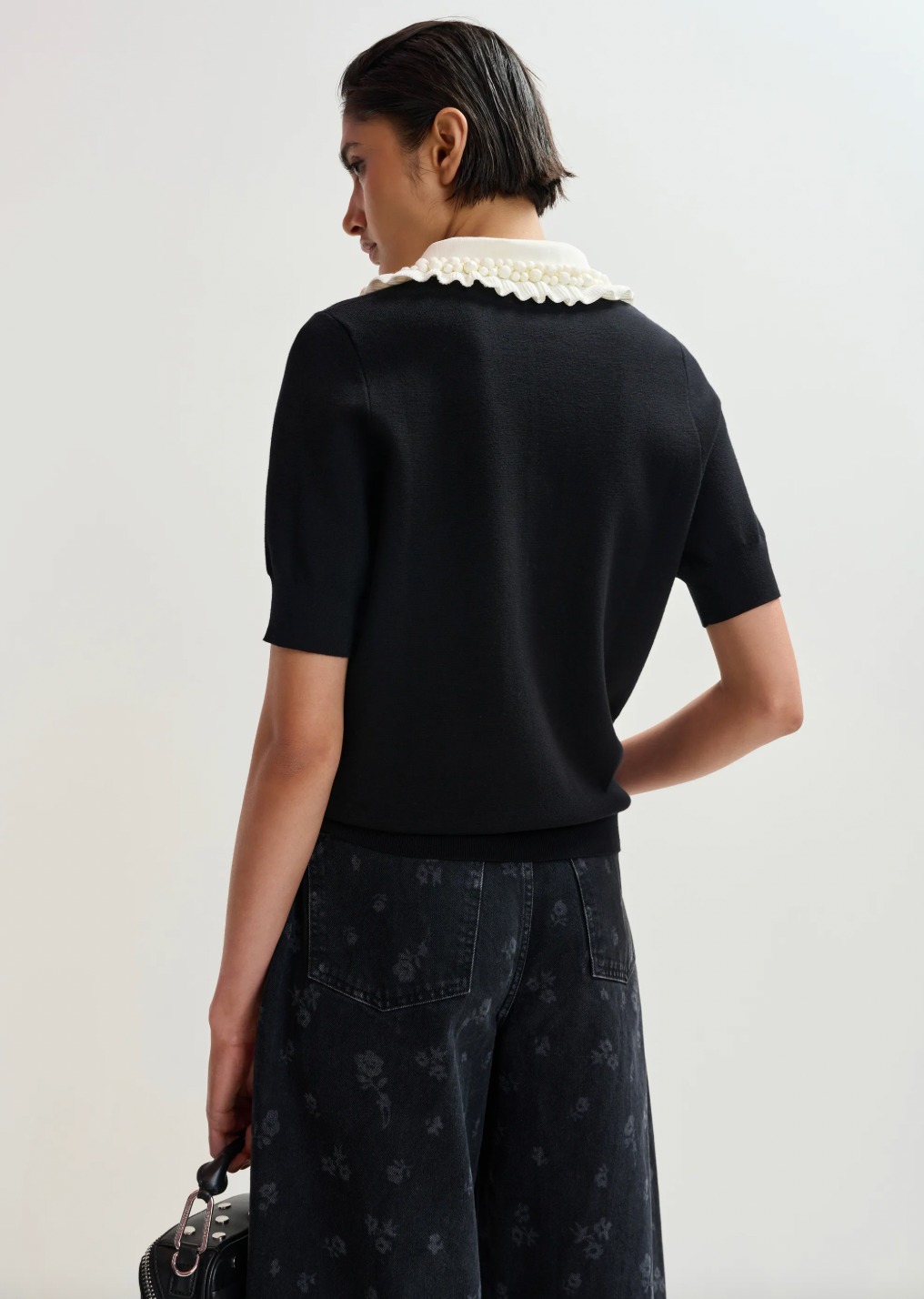 Polo features a relaxed fit through the bodice that tapers at the hips, making it ideal for pairing with high-waisted pants or skirts. The collar with ruffle and beaded details adds a touch of elegance, while the pearl buttons bring the finishing touches.