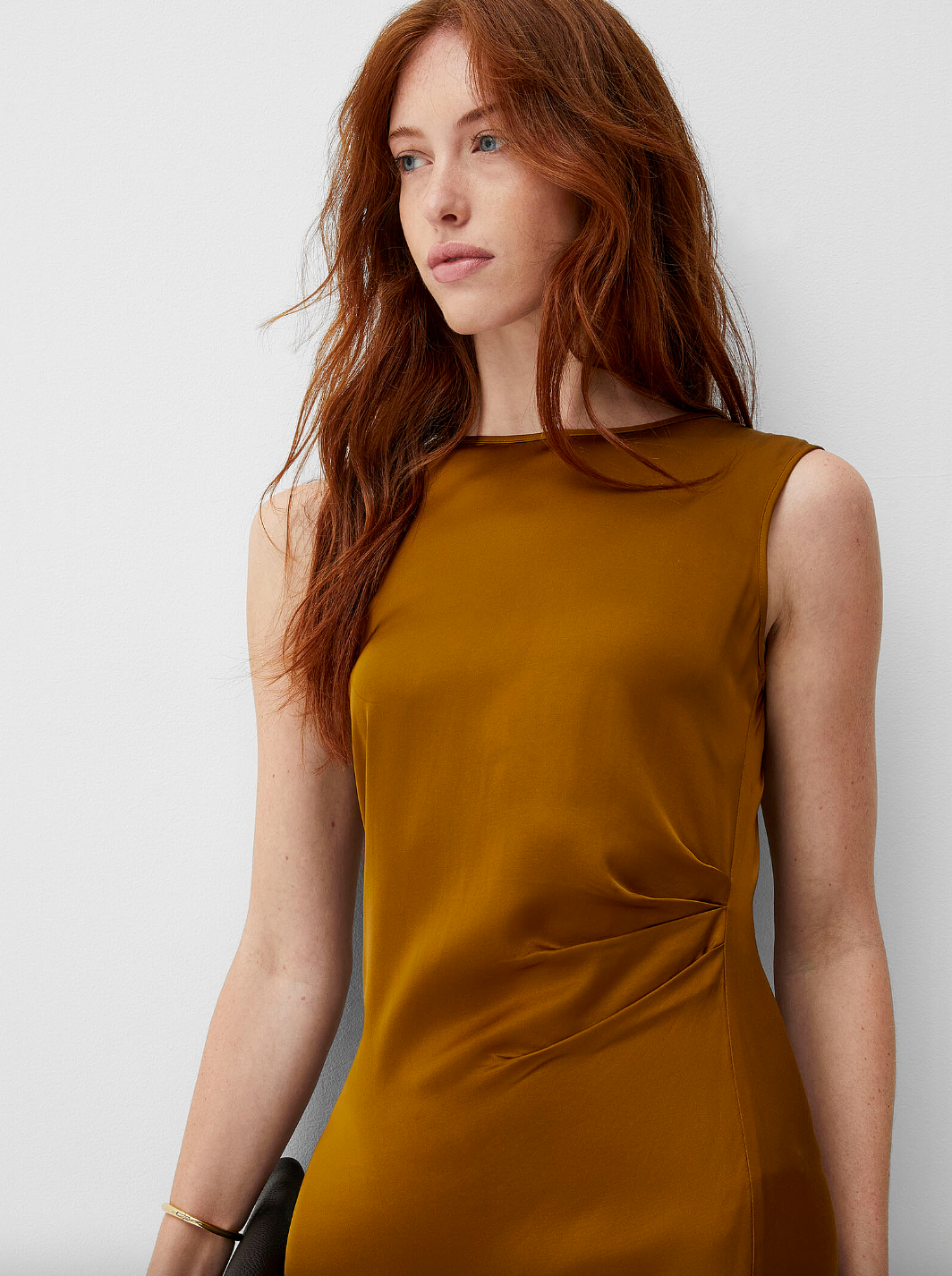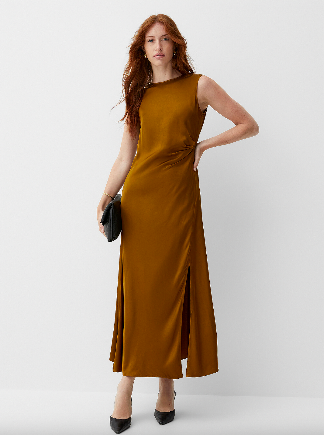 A beautiful for option for a fall wedding or event! The Kayla Dress is a sleeveless dress crafted in golden-brown viscose with a round neckline and side draping. Features a slit in the skirt and a smooth surface with a subtle sheen. A long silhouette with an elegant drape and modern feel.