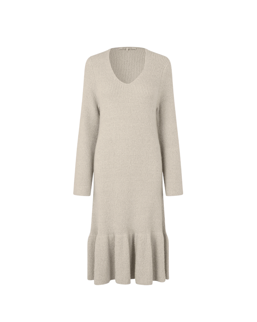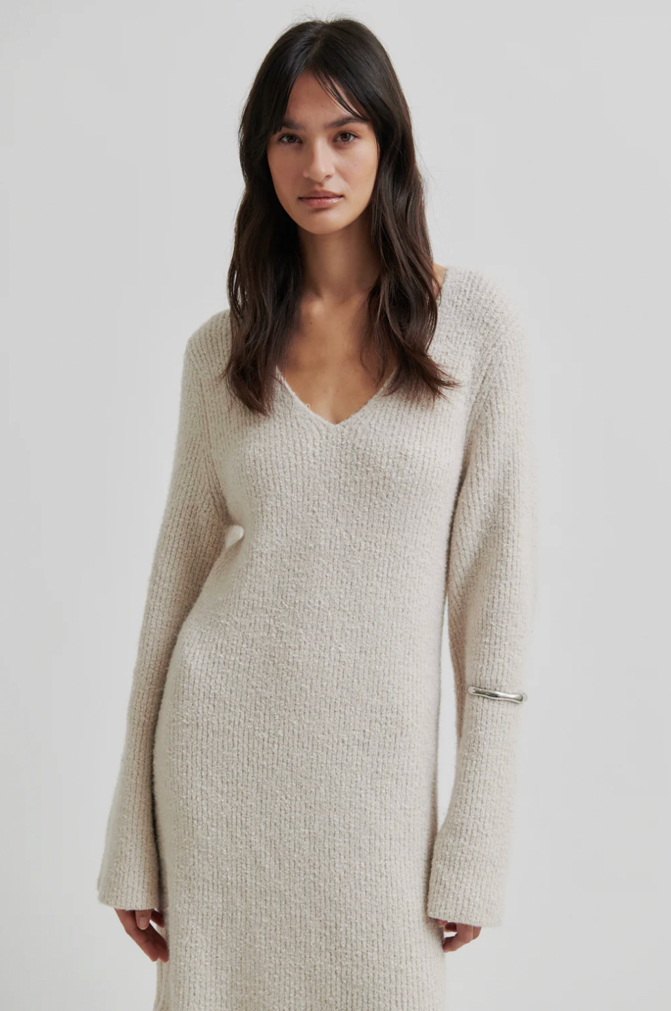 The dress is made in a soft and stretchy cotton blend with thick ribbed structure. Featuring a V-neckline and extra-long sleeves. Finer rib at bottom hem that creates a frill effect. Wide, relaxed fit.