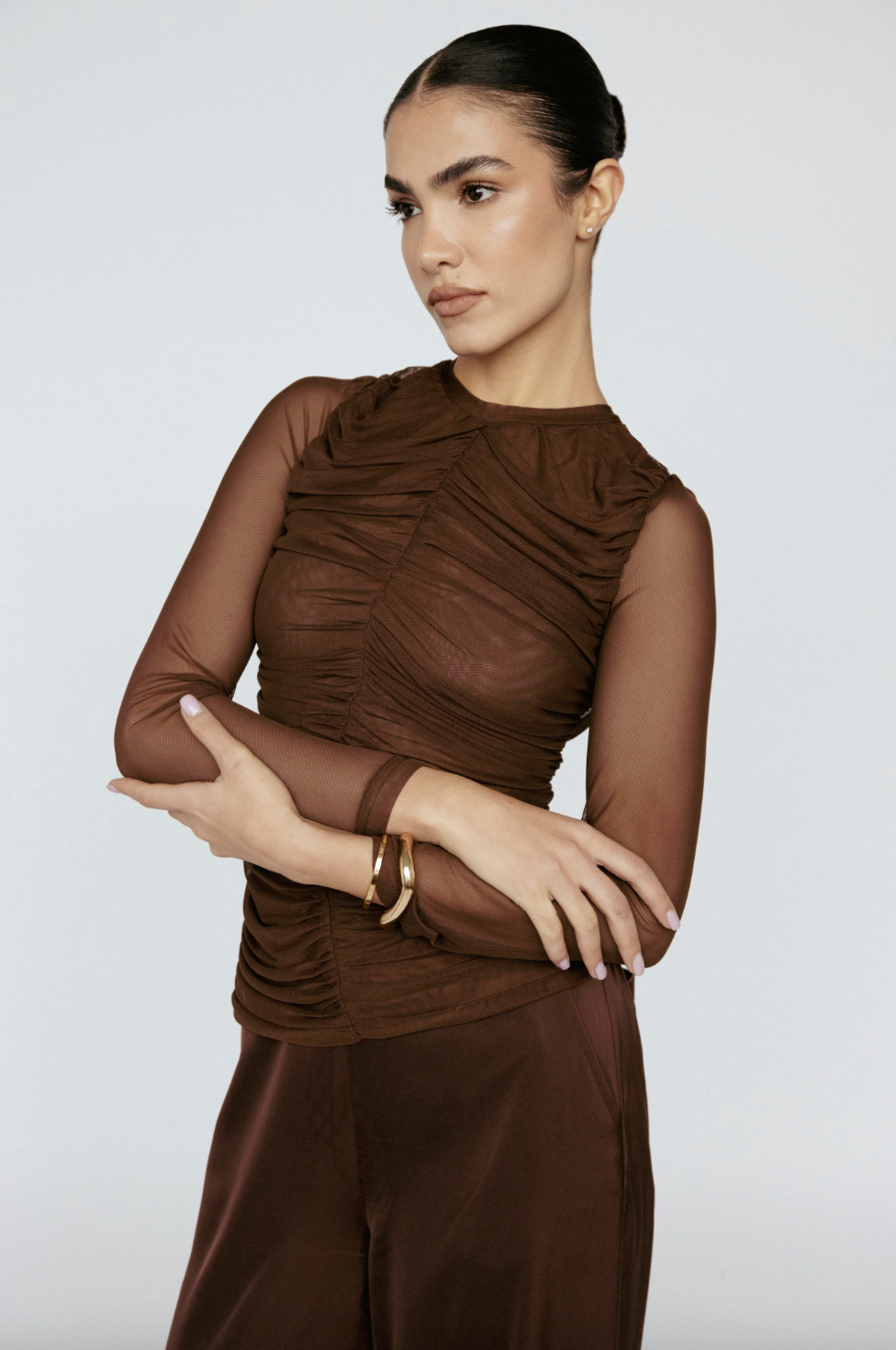 The perfect fall date night top! Crafted from sheer mesh, this top features delicate front gathering that adds texture and allure. Styled here with a nude bralette for a modern, confident look, it also ships with a coordinating camisole for added coverage—allowing you to wear it your way.