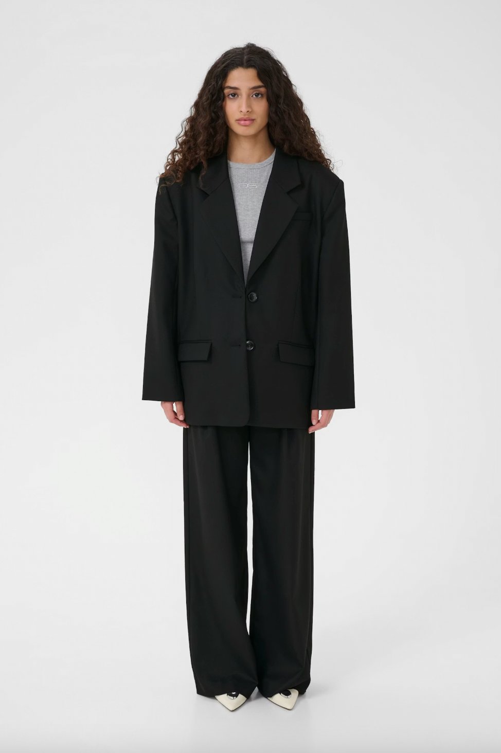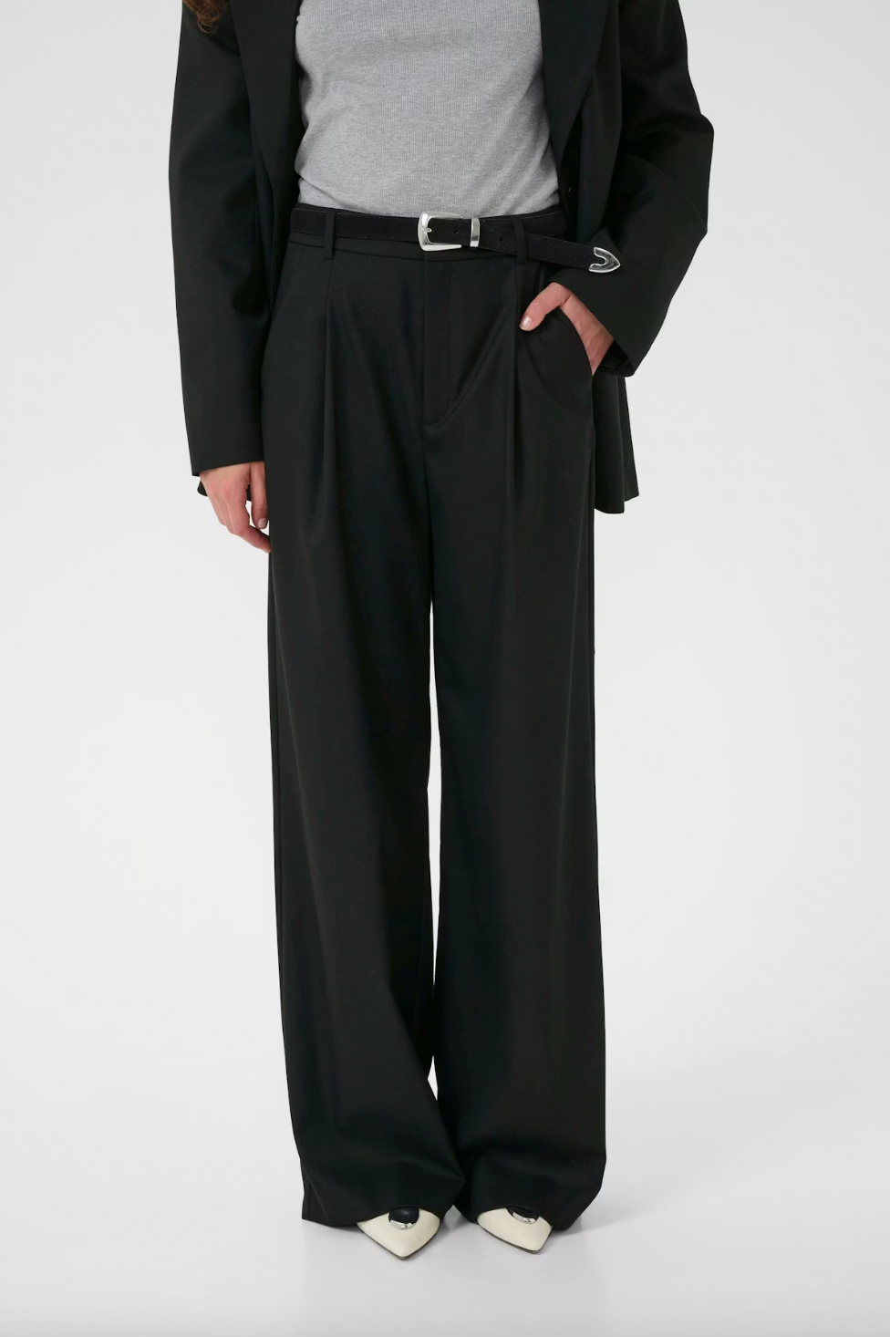 These wide-leg tailored trousers feature soft front pleats, a mid-rise waist, and belt loops for adaptable styling. Finished with side pockets and a clean back welt pocket for a smart, everyday look.