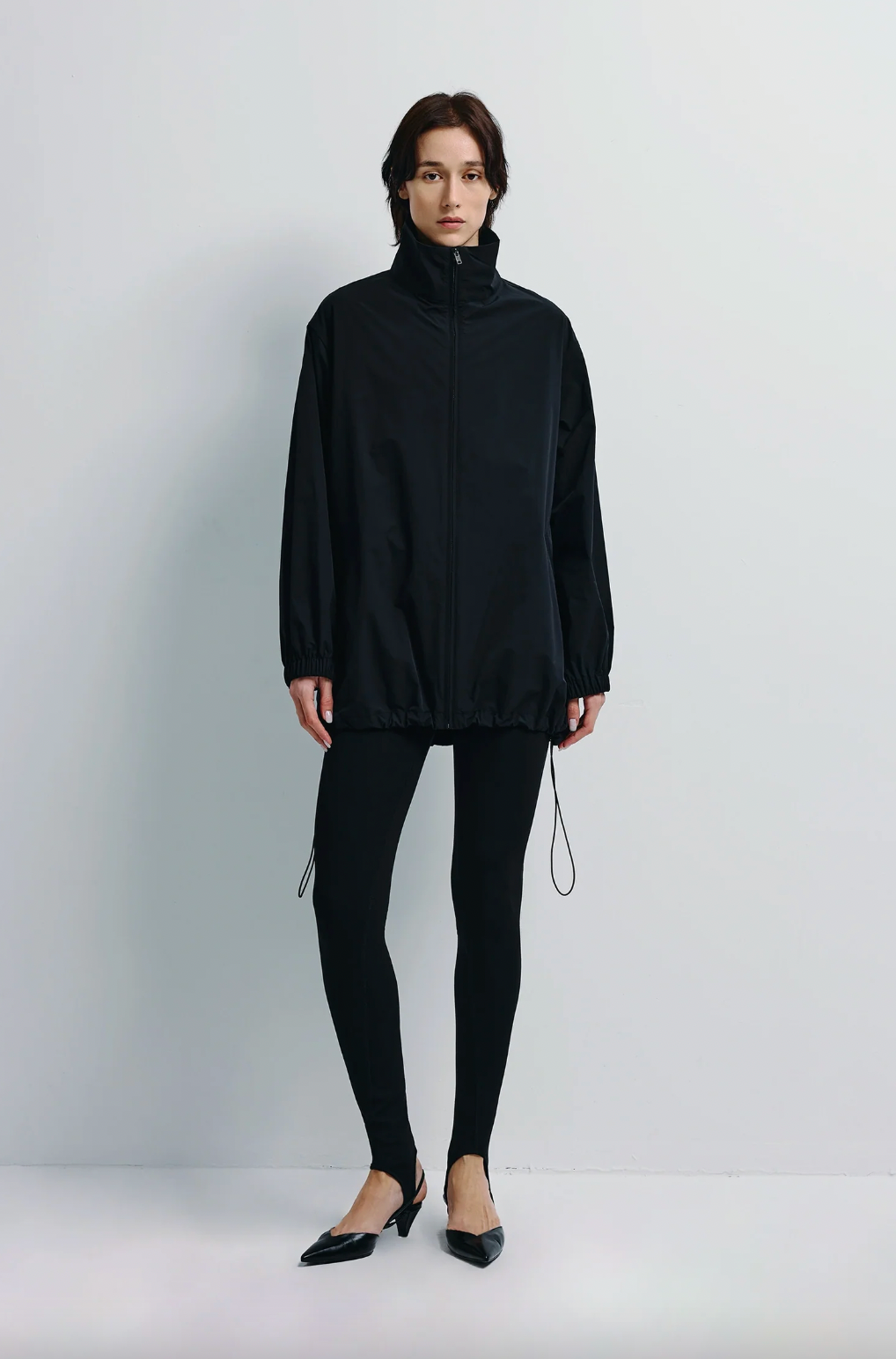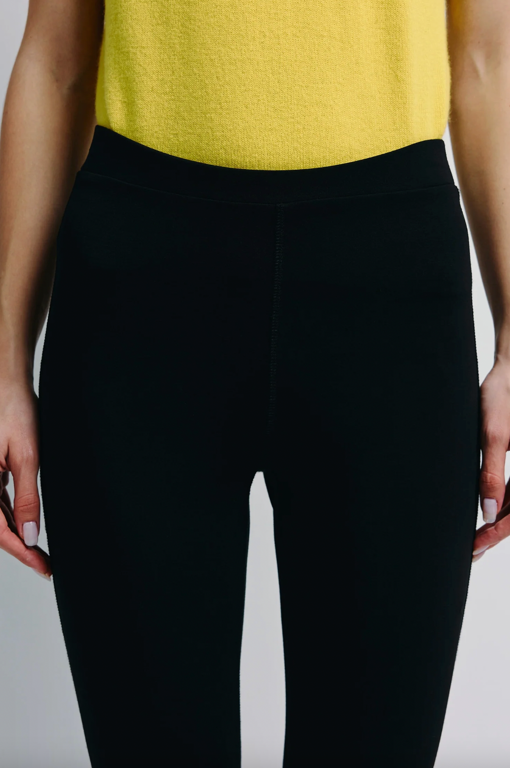 Cotton-spandex stirrup legging in sleek black, designed with slim fit and functional finish, offering streamlined style from day to evening layering.