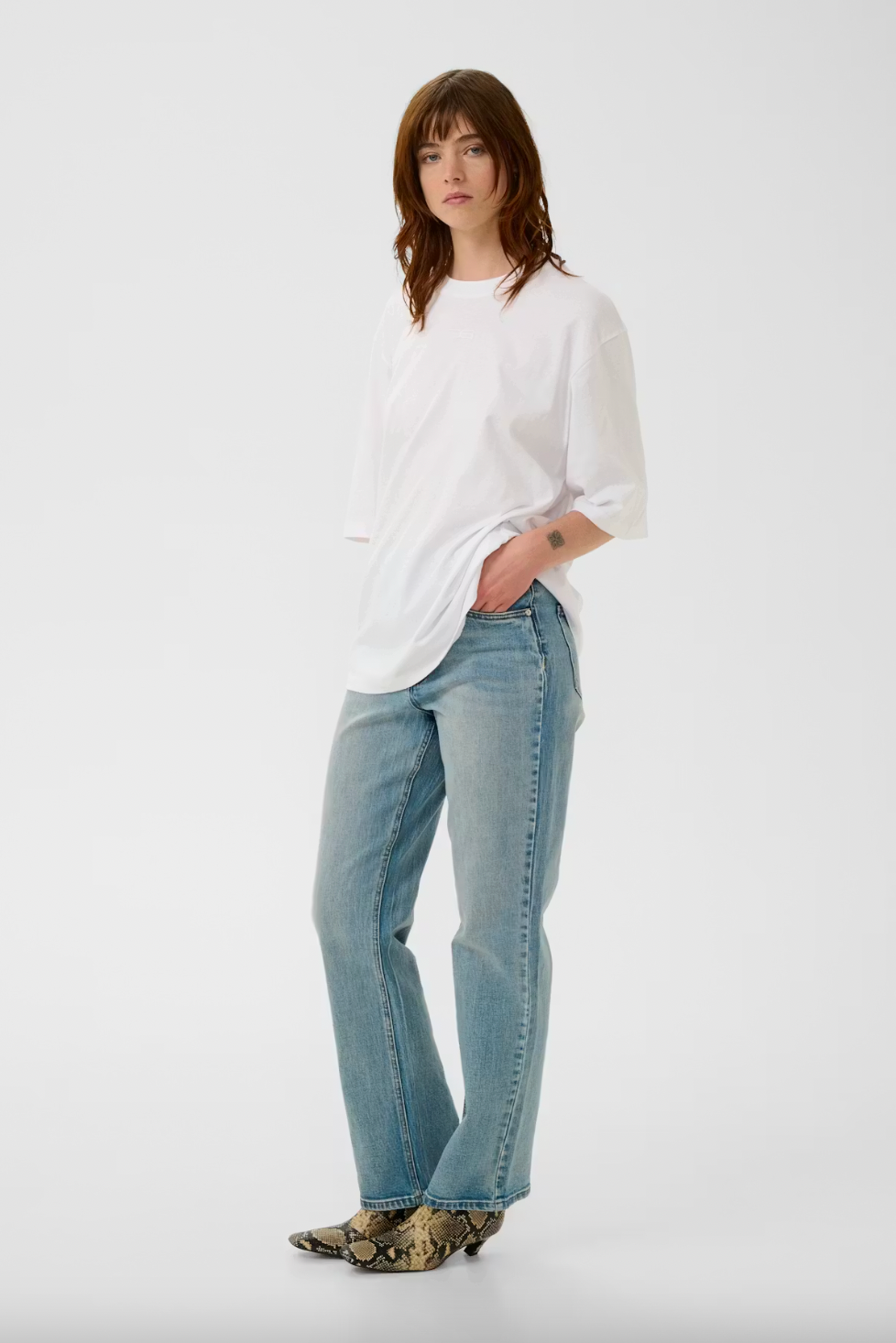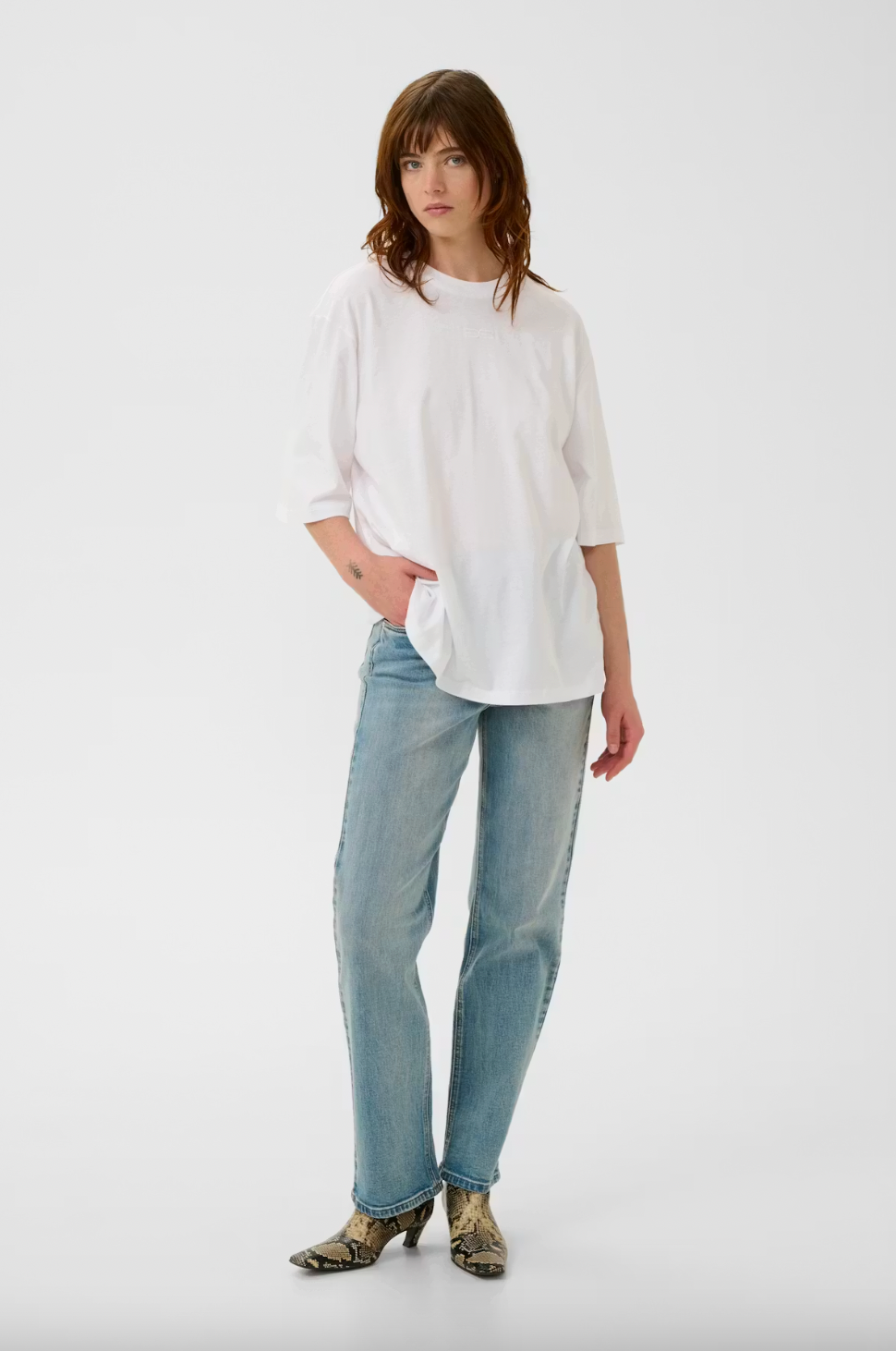 Relaxed-fit T-shirt with dropped shoulders and wide sleeves for a casual silhouette. Features a classic crew neckline and tonal front logo detail. Crafted from soft, breathable fabric for everyday comfort.