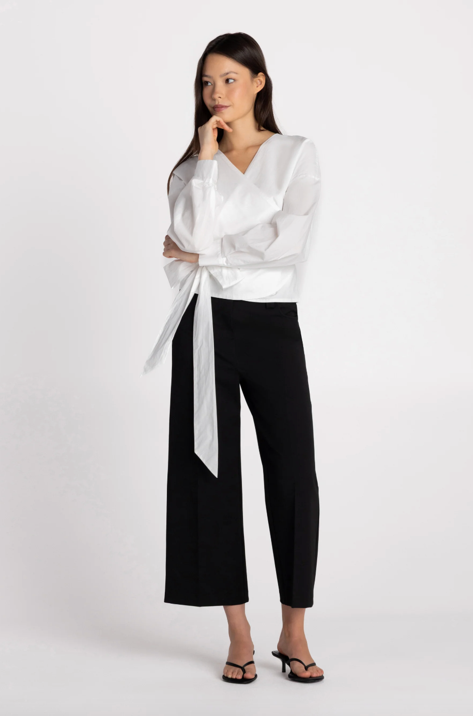 The Penelope Wrap Shirt is designed for versatile styling with a refined smart-casual feel. Made from slick, crisp cotton poplin, it delivers breathable structure with a clean, polished finish. The contour silhouette wraps naturally at the waist, with adjustable ties that can be styled at the front or back in a bow or worn loose. Long sleeves with button cuffs add tailored detail. Falling slightly below the waist, this wrap top transitions effortlessly from workday to weekend.