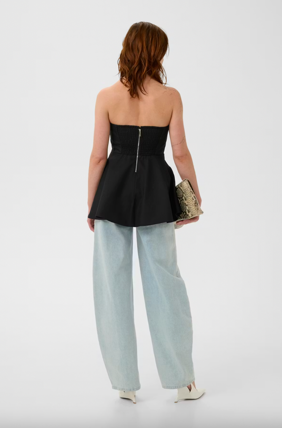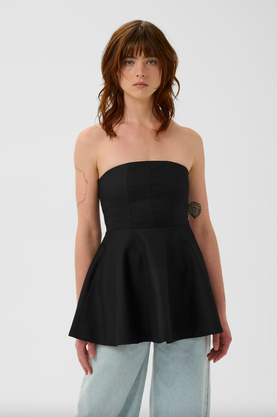 Discover this strapless peplum top for women, designed with a fitted bodice and flared silhouette for elegant comfort. The structured neckline and sleeveless cut offer a flattering fit, ideal for both formal and casual occasions.