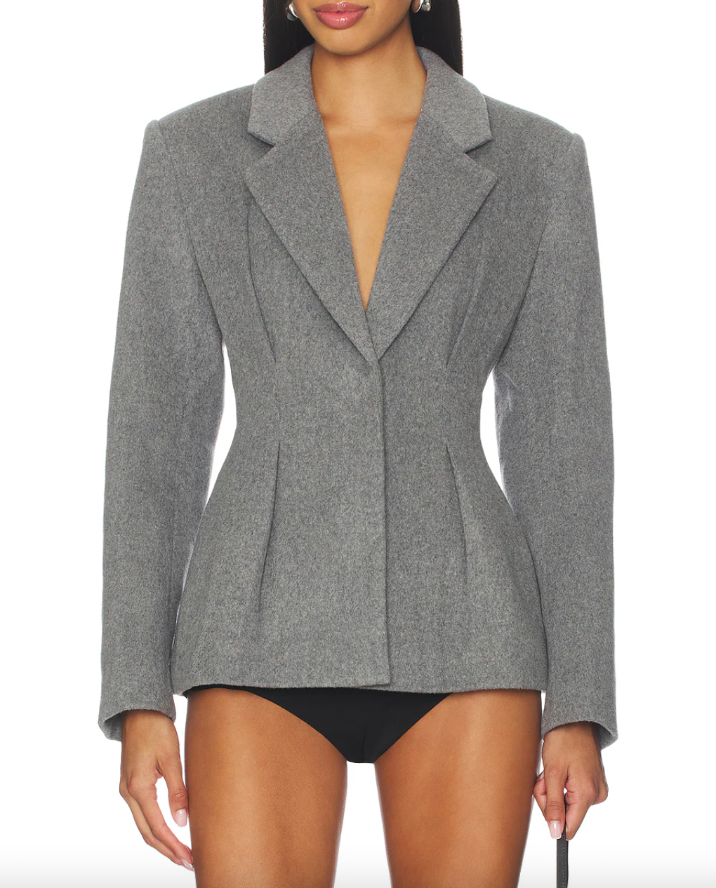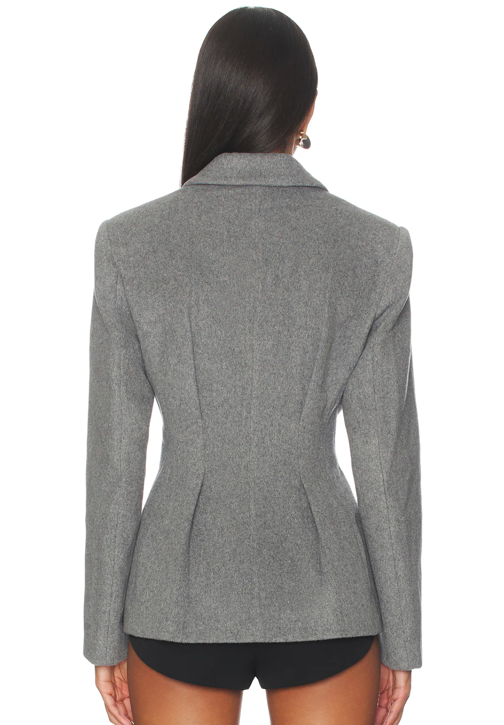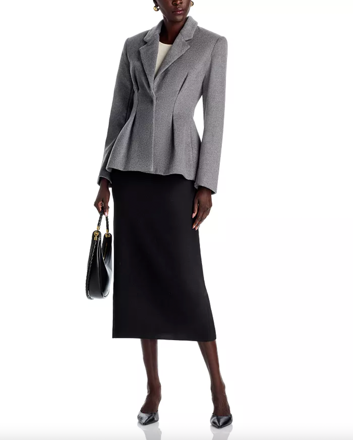 A pleated waist defines this tailored wool-blend blazer. Structured and sculptural with strong shoulders and softly contoured shape.