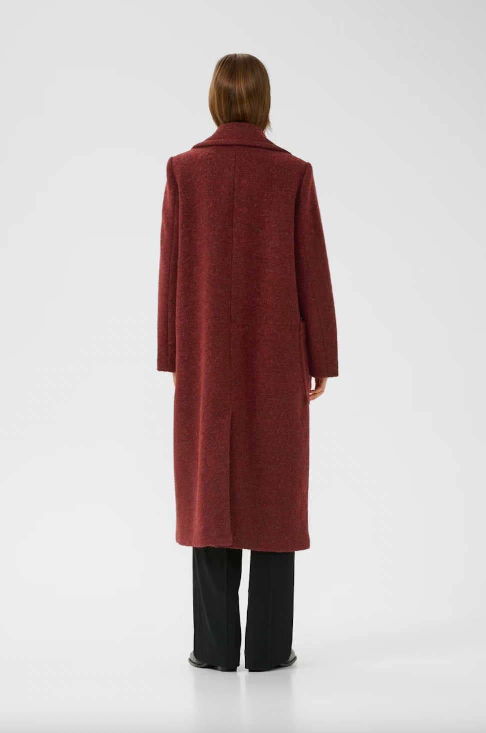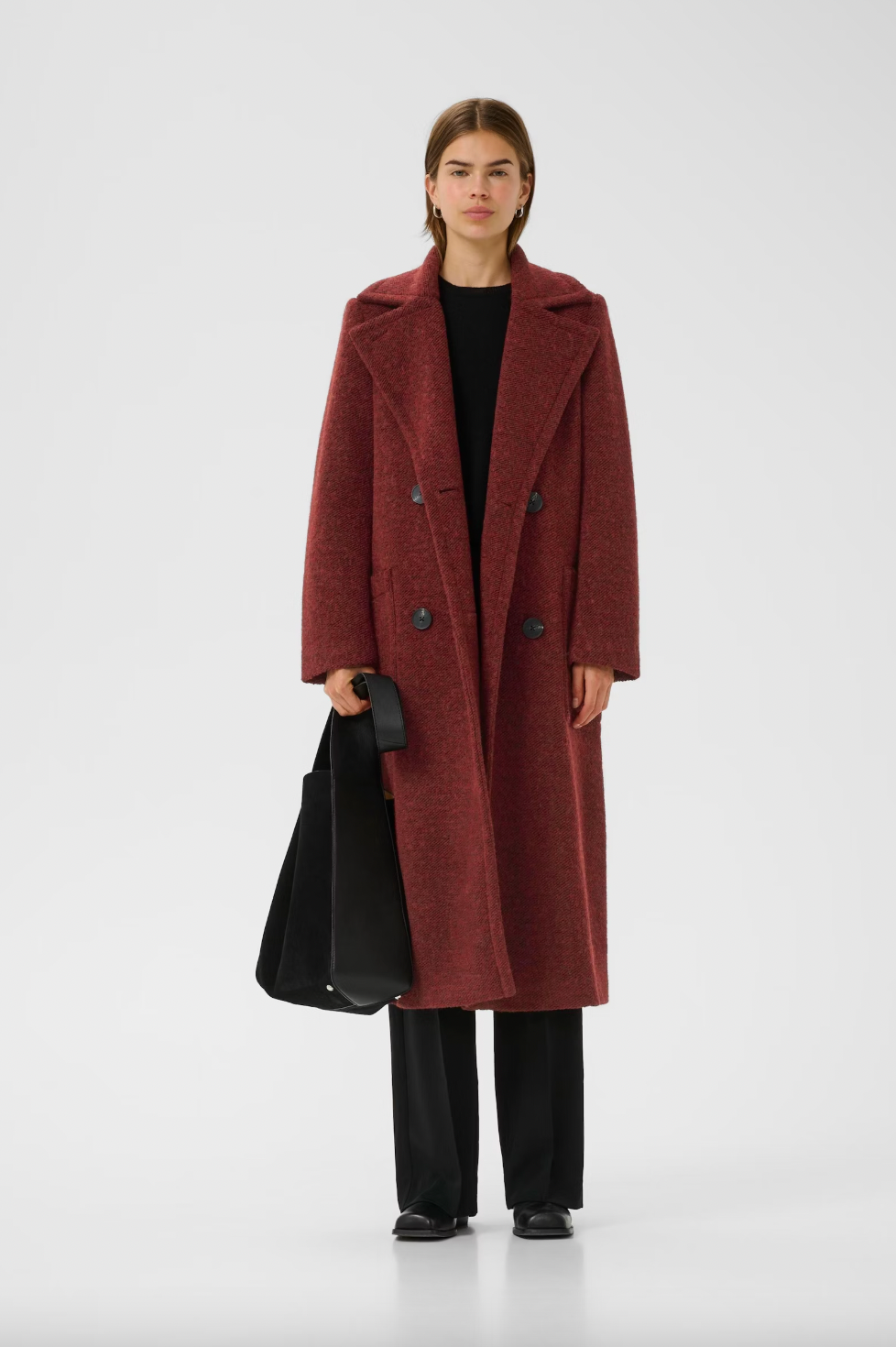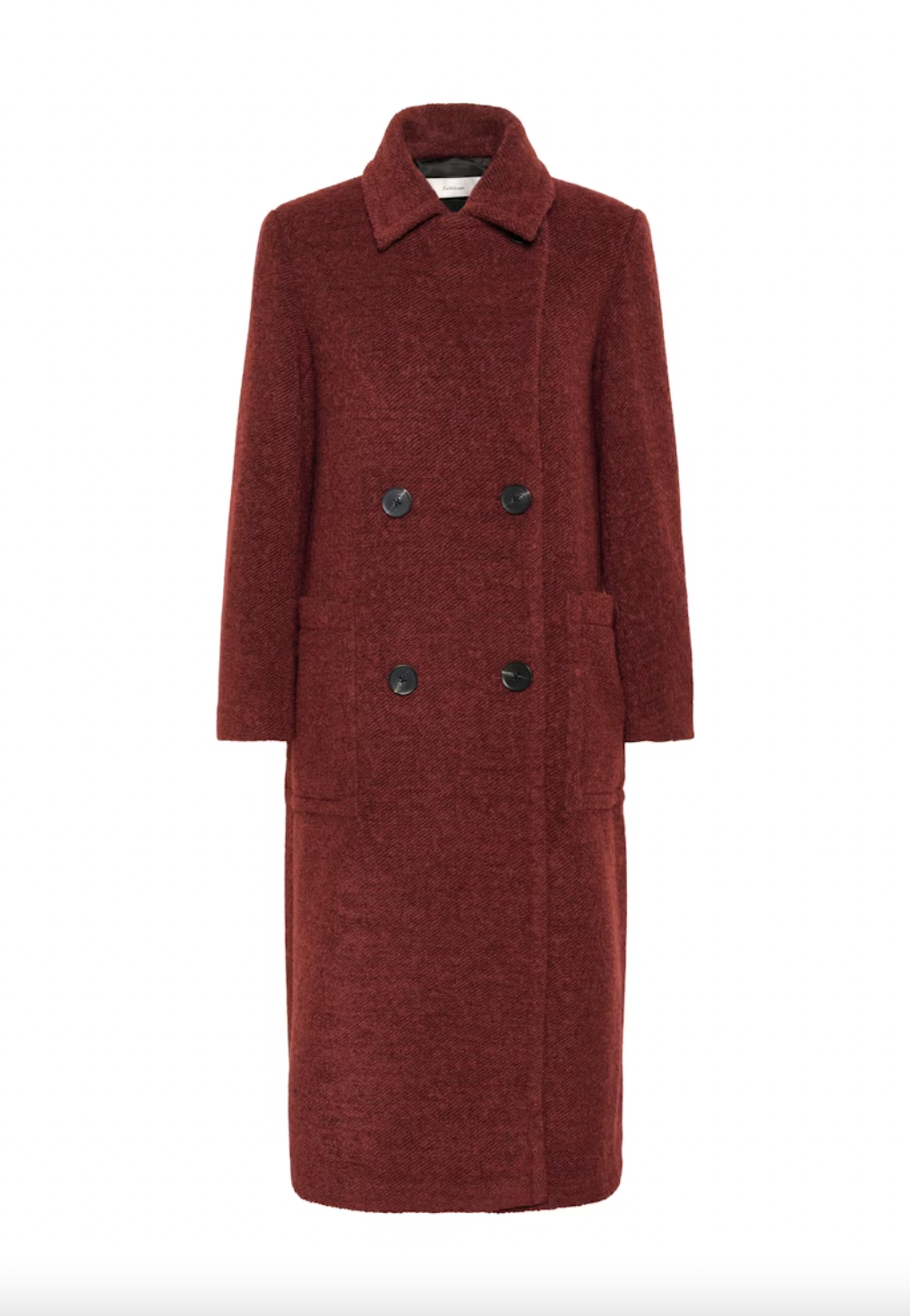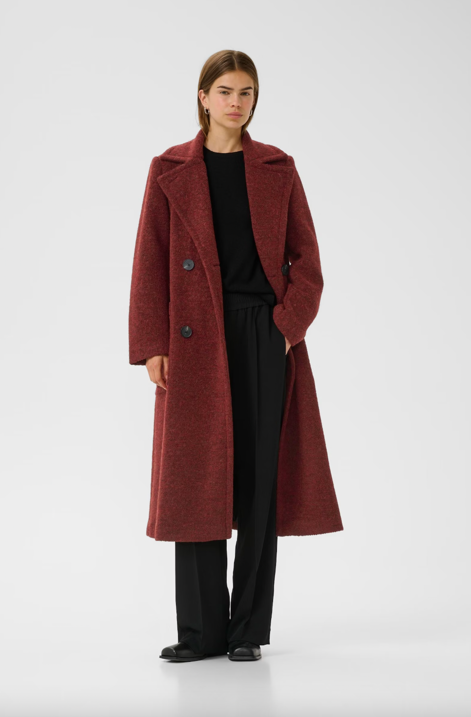 Double-breasted long coat offers a relaxed fit with structured shoulders and a notched lapel neckline. Features classic button closure and full-length sleeves for versatile, comfortable outerwear styling.