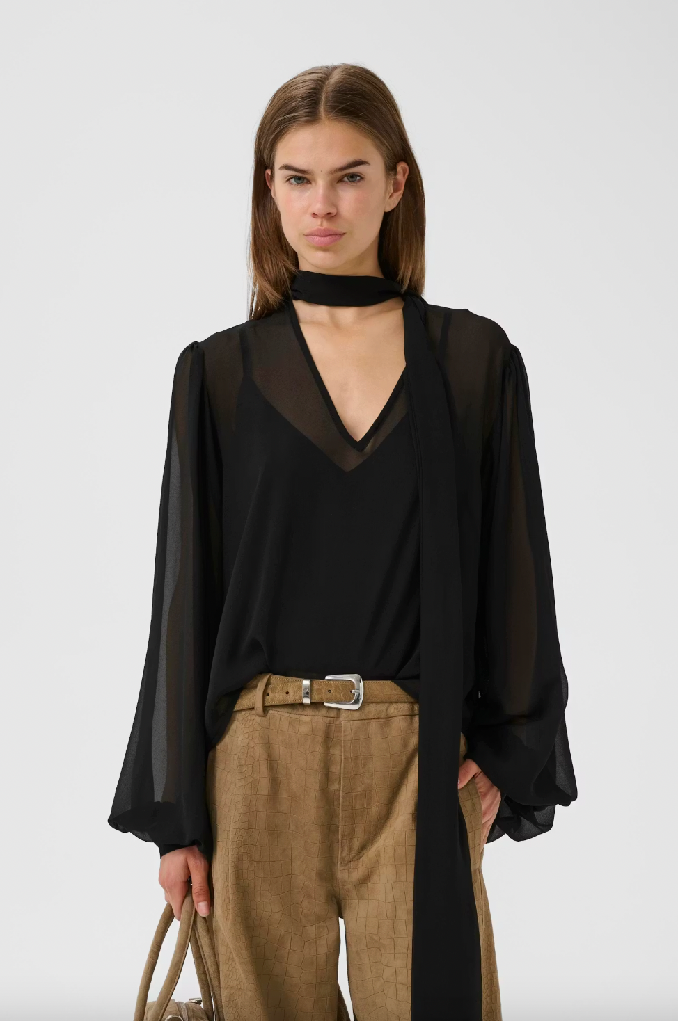Sheer blouse with relaxed fit, featuring a deep V-neckline, long voluminous sleeves with fitted cuffs, and elegant neck tie detail. Designed for comfort and effortless style in everyday and evening looks.